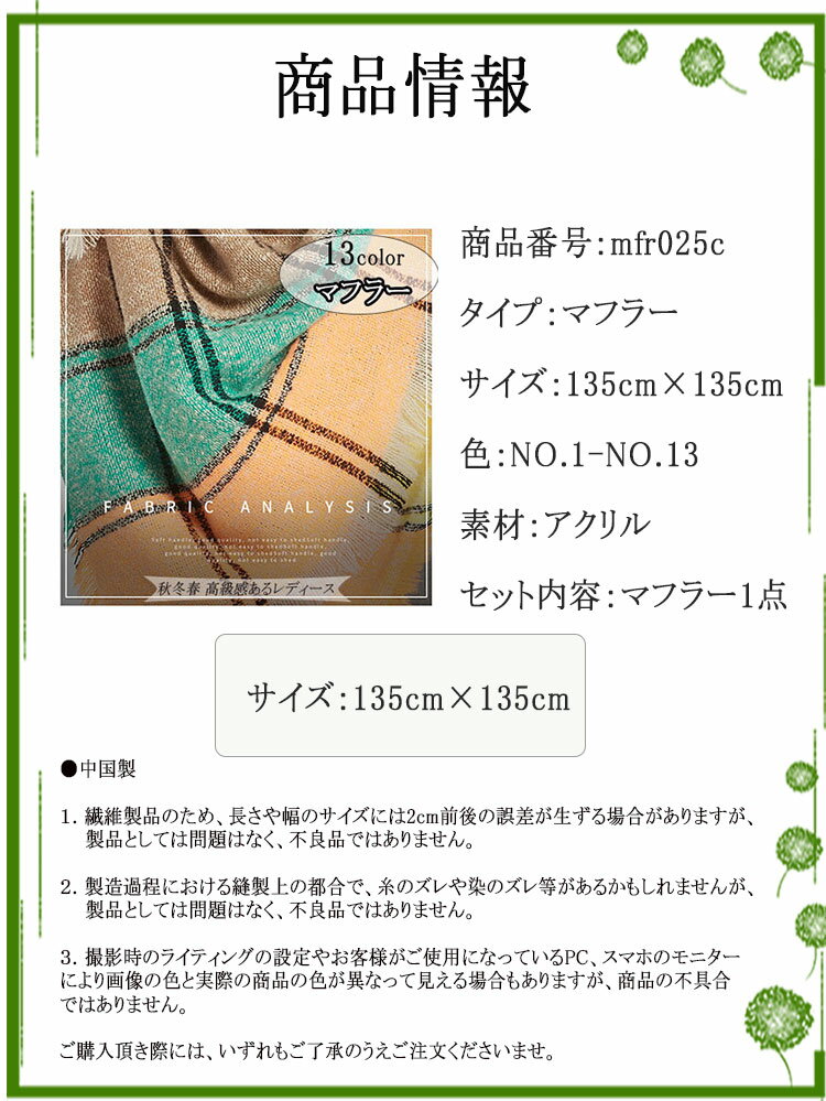 商品名:マフラー 首元/襟元を飾る/守る レディース/メンズ お揃い 秋冬春 大判 防寒マフラー 素材 カラー サイズ ポリエステル (NO.1-NO.13) サイズ:135cm×135cm 生地の厚さ 透け感 伸縮性 普通 - ややあり 生産国 セット内容 CHINA セット内容:マフラー1点 洗濯表示 平成28年12月から洗濯表示が変わりました 変更以前に生産された商品には旧洗濯表示が付いております。